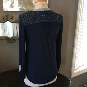 Anthropologie’s brand Tiny Navy Blue and turquoise print pullover top in a Rayon/poly blend. Size is XS but fits generously. Silky in the front and stretch Knit in the back. Bought from Anthropologie, Worn only a couple times - looks new. Measures 19.5” across underarm to underarm laying flat with additional stretch