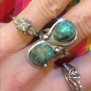 Absolutely gorgeous and timeless, this antique sterling silver and 100% natural Montana turquoise ring is a true show piece! In amazing condition! Slight pitting on one stone, but, adds to the antique charm of the ring! Approximately a size 6. Could be used as a midi ring!! A true must have for any antique turquoise collector! Handcrafted in America circa 1950-1960 in Montana. Is a family piece. My great grandfather was a Montana state senator and the Montana senate pro temp from the 60s-80s.