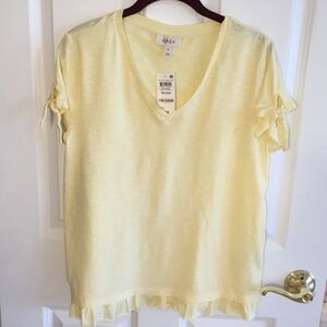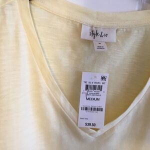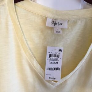 Brand new with tags. From Style & Co. Beautiful light yellow called Lemon Meringue on this short sleeve V-neck tee. Size is Women’s Medium. Cute bows accent sleeves and ruffle at hemline add details. Showing views of front and back sides along with fiber content information.