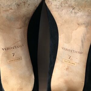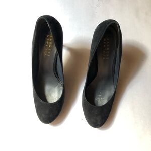 Black round toe heels from Barney’s. Size 7. Genuine leather. Some areas of the shoe look like they are “distressed” and are fading to a lighter color. Heels look like they need to be reheeled. Please ask any questions.