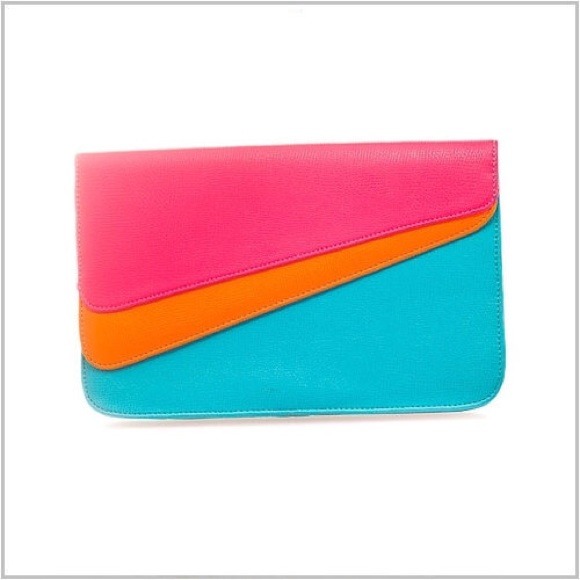 Multi-color clutch handbag features diagonal front fold-over flap. Bright turquoise, orange, and fuschia textured faux leather flap closure on front, and turquoise on reverse. Magnetic snap closure, fully lined turquoise fabric interior, inside zipper pocket, two inside open pockets. Gold-tone detachable chain link shoulder strap. 11"L x 7"H