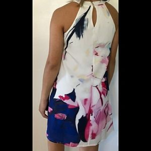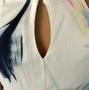 Brand New Boutique Item- Colorful Abstract Design in pink & purple on White. This Sexy little dress is fully lined, Great for a spring or summer event. Side zipper and back tear drop with button closure.. Flowy Polyblend fabric.