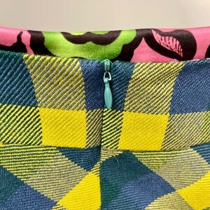 Sincerely cute plaid A-Line mini skirt. 100% wool and fully lined with (what I assume is) a polyester lining shell in teal. Pretty contrasting waistband lining (does not show when worn). Invisible zipper closure. Two sweet (albeit small) pockets.