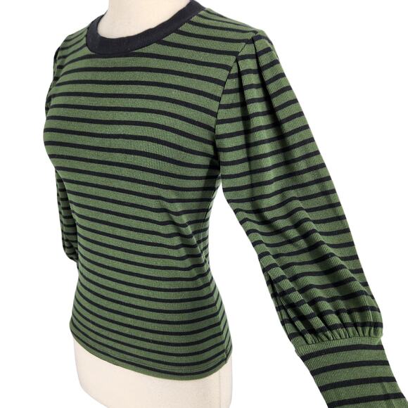 SALE DKNY Jeans Green Black Stripe Mutton Sleeve Pullover Knit Top Sweater Small