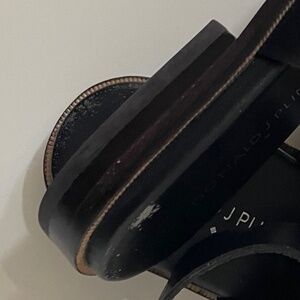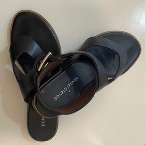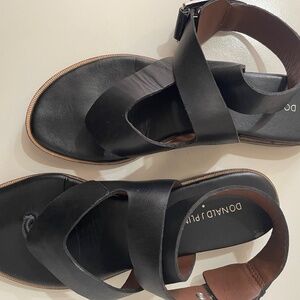 ☀️SALE☀️ DONALD PILNER Black Leather Ankle wraparound thong sandals. Adjustable leather ankle strap with silver hardware/buckle closure. Leather insole with stacked low heel. Heel measures approximately 0.75". Synthetic/rubber sole Size: 6.5 M Color: Black. Condition: Very Good Condition. No stains, wear, tears or scuffs on leather. Scuffs only on outer sole (see photos).