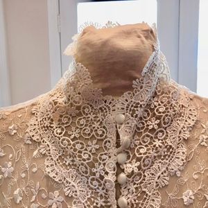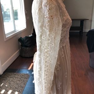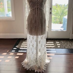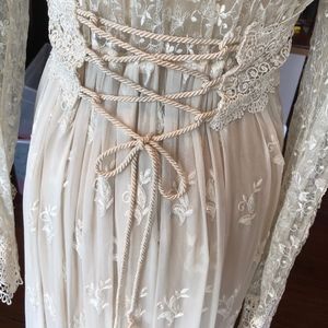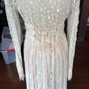 Lounge in the luxury and comfort of this flowing gown. NWOT This Martin McCrea ecru empire waist, lace, & embroidered, delicate flowing tulle overdress w/ silk covered buttons and button loop closures in front so it may be worn closed or open. Bodice embroidered with Guipure lace lined w/silk & tVenise lace accents & trim. Corset detail in the back w/ Venise lace. Delicate w/ detailed long sleeves & intricate details; gown back has silk rope /embroidered chiffon.