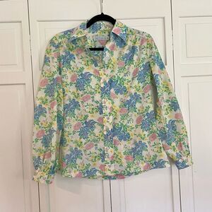 Lilly Pulitzer esque print with crisp buttons and button closure at cuffs in good condition! Bright floral print