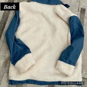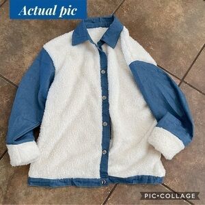Denim & White Furry Jacket/Top. Jacket has furry cuffs & back is all furry. Snaps up the front. Jacket is NOT heavy so can be worn as a top/accent piece. Runs slightly small. 80% Poly 20% Cotton