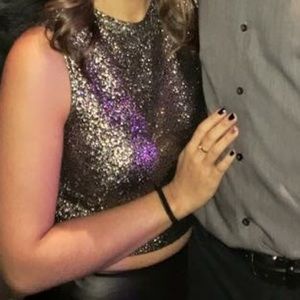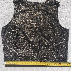 Zip up, gold shimmer crop top. Has slight stretch and very comfortable. Refer to measurements and fabric make in photos as shown.