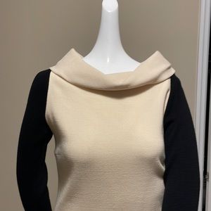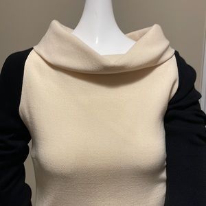 THIS DRESS IS SO UNIQUE YOU WILL BE THE ONLY PERSON WEARING THIS.., there are so many beautiful details: fold over collar, coveted buttons, body conscious fit, long black sweater type sleeves ask any questions if interested measurements available MADE AND PURCHASED IN ITALY ORIGINAL PRICE $1500 FABRIC IS WOOL DRESS IS BOUCLÉ TYPE WHILE SLEEVES ARE SWEATER TYPE FABRIC