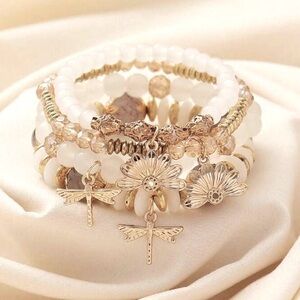 SALE Iridescent Ivory Beaded Dragonfly Flower Charm Bracelet Set