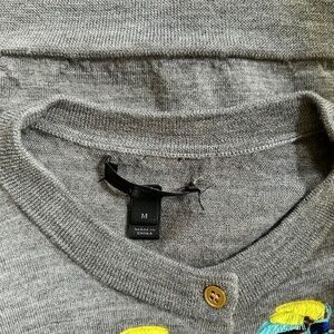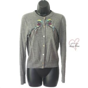 Who doesn't love J. Crew's classic Jackie cardigan? All of the things you love about this sweater, but with the most vibrant and uniquely embroidered pheasant pattern and brass colored buttons. Please note that the tag arrived detached from one side (see photos), if that matters to you you'll have to reattach it or it could be easily removed without harming the sweater. Also in case you're not familiar with the Jackie cardigan silhouette, it has a little extra stretch built in to the weave at the waist and sleeves and that patternis visible in the last two images.