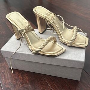 These stunning gold heels from Jimmy Choo feature a high thin heel that enhances their elegant silhouette. The open toe design and delicate twisted straps add a touch of sophistication, making them perfect for any upscale occasion.