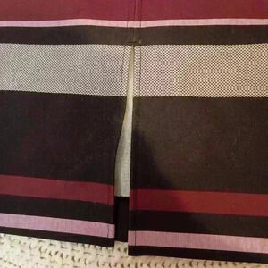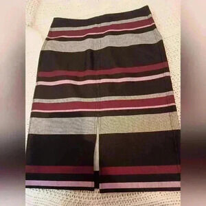 Add this very cute midi skirt to your wardrobe.It has a cute slit in the front.Its got a very cute color striped pattern with black, burgundy merlo and purple.Its in brand new condition and it's size xs.