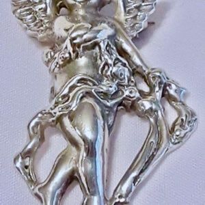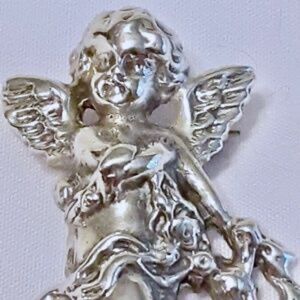 This cherub is made of .925 Sterling and is in pristine condition. Swags and flowers accent the 2in pin/brooch which can also be worn as a pendant.