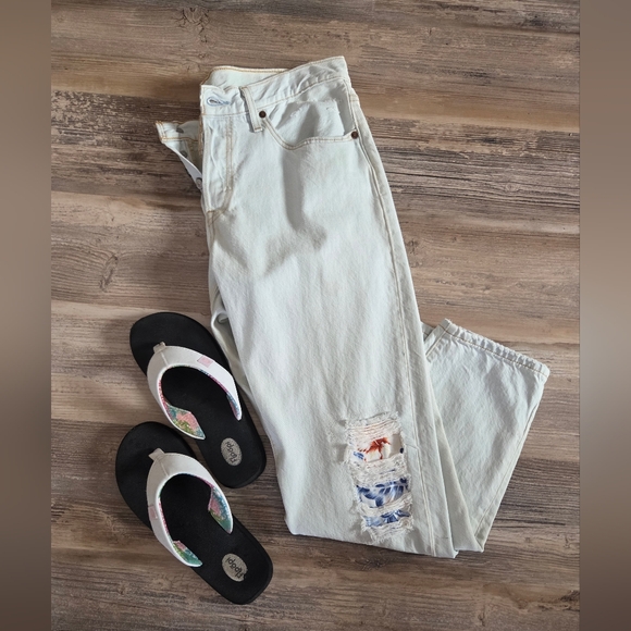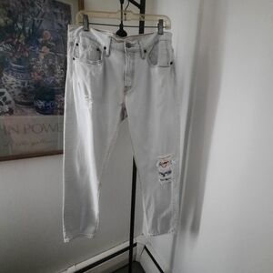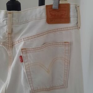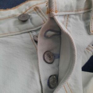 Ladies Vintage Levis 501. Original "button fly" closure, red label and brown patch on back of jeans. Original printed cloth under cut pant leg. 100 percent cotton. 31x28 waist and length. Light brown stitching looks very nice with faded blue color of the jeans. Faded blue is the color, not white.