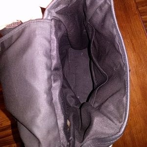Heavy duty nylon like material (not leather) in very good condition. Has dark brown trim with black and green camouflage bottom. Two outside pockets on both sides for bottle and umbrella. One small inside pocket and one standard outside zippered pocket. Top flap only closes by a metal buckle, does not have a zipper or anything to fully seal inside compartment.