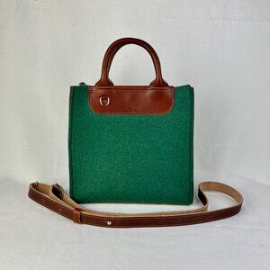 Used twice! Stunning Lovi Petite Tote featuring premium forest green wool felt construction with luxurious cognac leather accents. This versatile crossbody showcases impeccable Scandinavian design with two spacious interior pockets and an adjustable/removable leather strap. The signature D-ring hardware and embossed Lovi branding on the leather flap add sophisticated detail. Perfect for everyday use, this petite tote combines form and function with its structured silhouette and practical size.