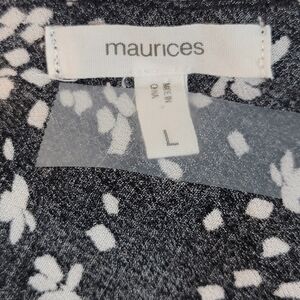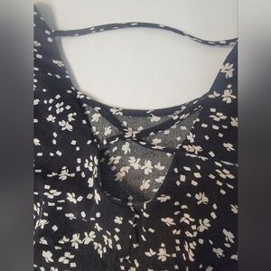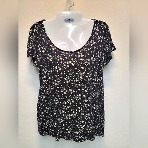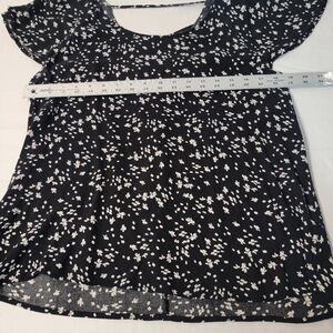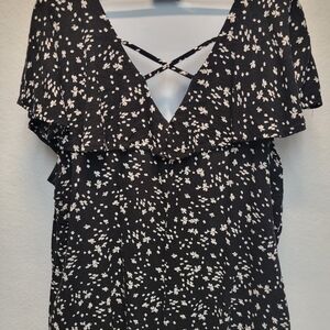 Maurices women's size large cap sleeve black and white floral top. sleeve ruffle extends across back, crisscross accent on back. ( bin c)
