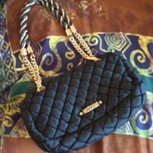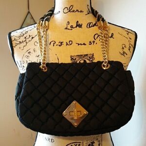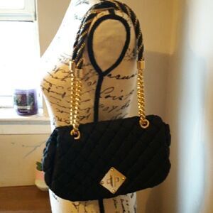 100% AUTHENTIC LUXURY BRAND MOSCHINO BAG. CLASSIC STYLE, SHOULDER BAG, CAN BE DRESSED UP OR DOWN. I BELIEVE MATERIAL IS NYLON, QUILTED WITH GOLDTONE HARDWARE. OUTSIDE IS IN EXCELLENT CONDITION.