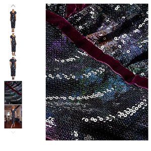Dark bluish grey sequins, floral print, maroon/purple velvet lining