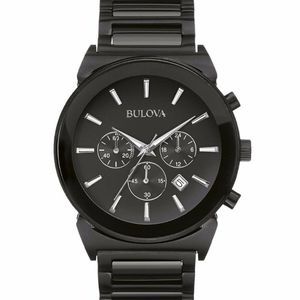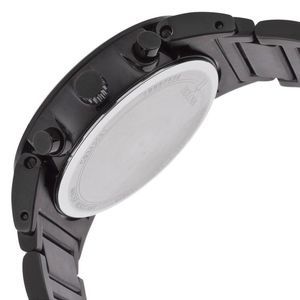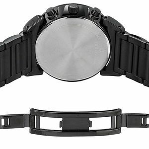 Chronograph in stainless steel with black ion-plated finish, domed metalized crystal, black enamel dial,, calendar, small sweep, deployant closure, and water resistance to 30 meters.