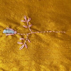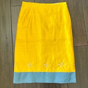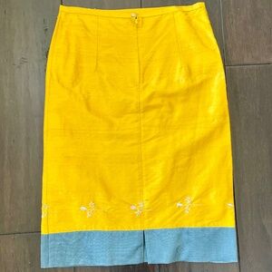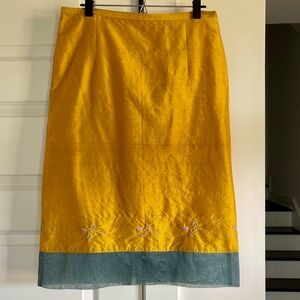 This is a unique piece (literally). This lightweight skirt falls either on or slightly below the knee and is a deep rich gold with pink and silver-gray hand-embroidered flowers around the bottom. The slubbed silk lends a gorgeous texture. The hem of the skirt has a 3½ inch semi-sheer gray panel which gives the skirt amazing definition.