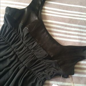 NWT Black Dress, Gathered Waist, Satin Trim. Stretchy and light fabric, originally $50, 5.5 inches from the neckline to the end of the gather under the bust. 21 inches from the end of the gather under the bust to the edge of the dress (length.) total length is 26.5 inches from chest to end.