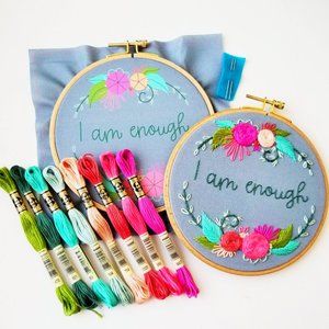 The embroidery pattern includes a stitch and color key, color close up photo of stitched pattern, the online video tutorial link, and the design sized for a 6 inch hoop ready to use again for future projects. The affirmations "I am enough," "Nevertheless, She Persisted" & "We can do hard things" are included in the instructions. Made in USA