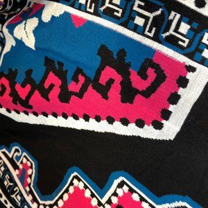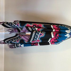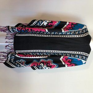 Alluring sweater cover-up in black and white with a bold pink and blue pattern. This one is sure to grab you compliments. It does not attach at the sides, you simply toss it over your shoulders and go. The sweater is a lightweight material, not like a chunky sweater. And no cover-up is complete without some fringe along the bottom. One size fits most. 100% Polyester. Please hand wash and lay flat to dry.