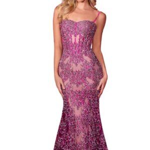 Wear this stunning dress from Portia and Scarlett PS25251 to light up the evening. Thanks to careful and accurate tailoring, the sleeveless design captivates with its sleek silhouette. The top features a mid-open back, a structured corset boning bodice, a sweetheart neckline, and spaghetti straps that define the shoulders. Over glitter lace fabric, lace appliques produce an opulent elegance and alluring attractiveness. The model is wearing Fuchsia Nude color The available color is Fuchsia Nude Fabric: Glitter Lace Origin: Made in the USA or Imported Closure: Back Zipper Occasion: Prom, Evening, and any Special Event. Product Details: Spaghetti Straps, Lace Appliques, Midrise Back, Corset Boning, Sweep Train Sizing tips: Every designer cuts their dresses differently & according to their size chart. Please measure yourself (in inches) before ordering & follow our size chart (pictured under the main dress picture). If you are in between sizes or unsure of the fit, choose a size up, as it is easier for your seamstress to take in rather than out. Please refer to the size chart in our images section. Care: Hand Wash only IMPORTANT: For bundle orders, please limit your order from 1 up to 3 dresses only to ensure transaction will proceed. We ONLY adhere to the Poshmark Policy of "Shipments over 10 lbs are not supported."