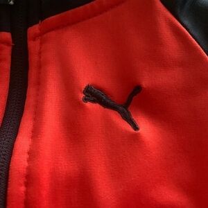 Stylish Puma tracksuit set in red and black. Features a zip-up jacket and matching pants with logo detailing.