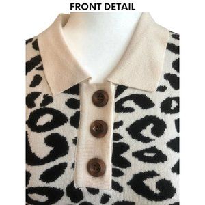 Adorable cheetah print sweater knit top with collar and half placket of buttons at the top. The top itself is beige and black and the buttons are a nice brown wood. It is super soft and comfortable. Great addition to your cool weather wardrobe. 55% Viscose, 28% Polyester, 17% Nylon. Please hand wash and lay flat to dry.