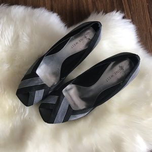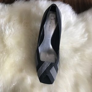 Pre-loved. Classic. Peep toe fabric, striped upper. Black stacked heel 3". Light marks on soles and partial tag on right heel. Some marks on insoles. Fabric in good condition. So chic!