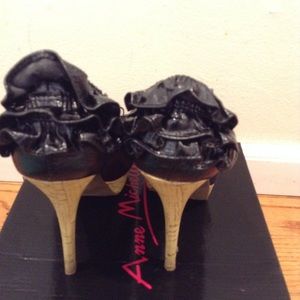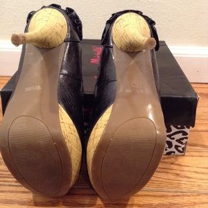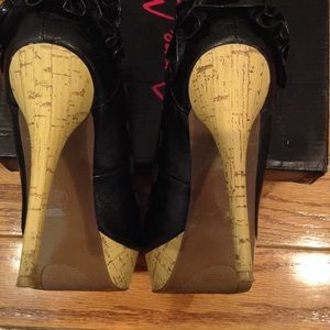 Open toe, stilettos, black, platform p, high heels, bow, ruffles, black with wood