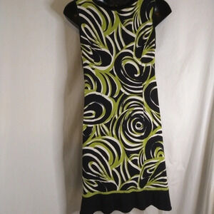 Fun paint strokes of green black and white. Ruffle detail on hem, sleeveless, midi length, and scooped neckline. Wear with a bolero or denim jacket. Excellent used condition, order it today 😊❤️👍