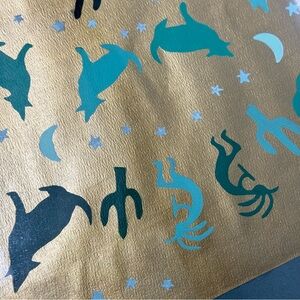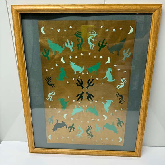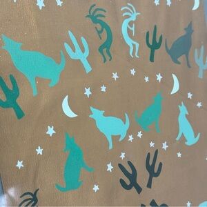 Gold with aqua green howling wolves, cactus, stars, moons and more