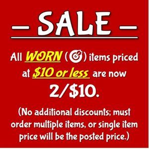 Check out my selection of worn items in good to excellent used condition! All WORN items priced at $10 or less are now 2/$10. You must choose two items for the price to be dropped, otherwise you will be charged the regular single item price (2/$10, 4/$20, 6/$30, etc.)