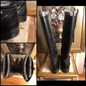 GORGEOUS COACH BLACK LEATHER BOOTS. BOOTS ARE 17” HIGH. SMALL 1” HIGH CHUNK HEEL. SILVER-TONED ZIPPERS/ACCENTS. EXTERIOR BUCKLE ACCENT AND COACH LOGO. 3/4 ZIPPER IN INTERIOR. INTERIOR IS BLACK LEATHER AT THE TOP, THE REST IS SOFT GRAY/BLACK GRAY/BLACK STRIPED FABRIC. THE BOOTS ARE IN EXCELLENT CONDITION. PURCHASED AT COACH STORE FOR $429. SZ 8.5 M (medium/regular width). PLEASE DO NOT HESITATE TO ASK ANY QUESTIONS. #coach #blackleather #kneehighboots