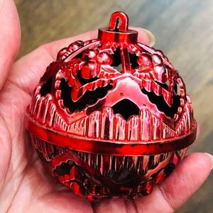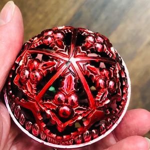 Red ornament is a round ball with cutouts & holly berries in very good condition - no cracks or scratches. built-in hanger is complete and intact. Approximately 2 3/4" dia (not including hanger)