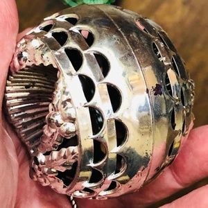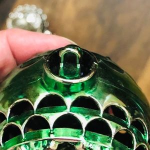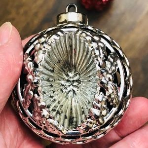 Green & Silver ornaments are vintage indented (2 sides) in very good condition. The silver has some discoloration to it. Both have their built-in hangers which are complete and intact - no cracks or scratches. Both have cutouts and holly berry designs. Both approximately 2 1/4" dia (not including hanger)