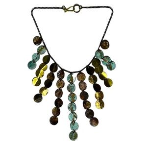 Looking on-line I believe the name of this necklace is "Damietta" by Sibilia. It is an absolutely gorgeous statement necklace made from 11 strands of copper/oxidized brass hand-hammered discs of varying lengths. It hangs around the neck like an absolute dream and is a perfect addition for any occasion. If you know anymore about this item, please don't hesitate to reach out and let me know about it.