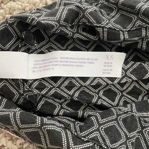 Black geometric print pajama top with light pink trim. Size XS. Front pocket and button front with collar. 100% tencel. Good condition, no holes or stains.