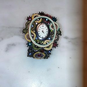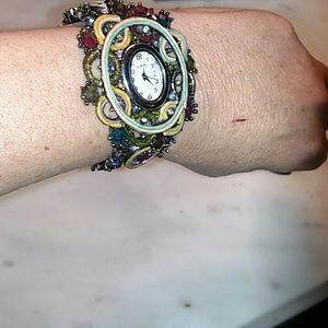 One of a kind unique statement bracelet watch from the Bahamas. Loads of handset beads and colorful crystals. Mother of pearl face. Just needs a new battery.