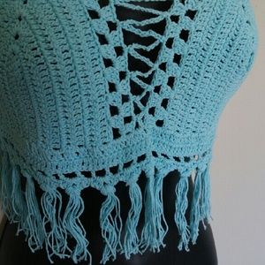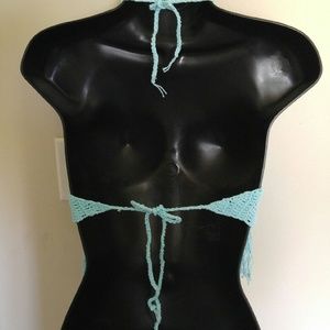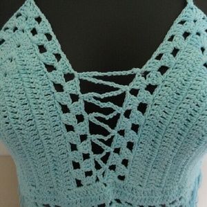 Beautifully Crocheted halter in bright rich teal/blue/turquoise - whichever you prefer ;) Neck and back ties are braided to give it that finishing handcrafted touch!