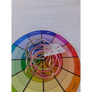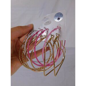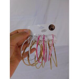 Includes a set of large hoop earrings in multiple designs: classic gold hoops, pink hoops, white hoops, and twisted gold hoops