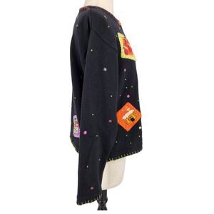 True Black, colorful button front, cardigan with contrasting blanket stitches. Hand embroidery of sweet winter themes, including Skates, mittens, hats, log cabins just to name a few. In Excellent condition, no flaws. A stunning vintage item in wearable preowned condition.