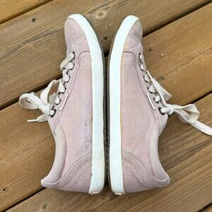 Taos brand, Star style, light pink canvas low top sneakers, lace up, cream or off-white laces, lightweight and comfortable, women's size 8, some marks from normal wear can be seen in photos, but in great pre-owned condition with lots of life left