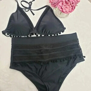 Bottoms are high waist, mesh panels and ball fringe detail.