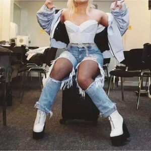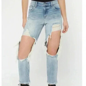 Show off your style in these edgy, ultra destructed boyfriend jeans. They feature a frayed hem and blown out knees in a faded medium wash.